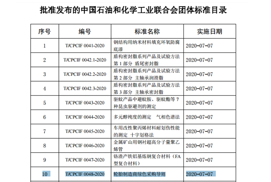 2020年4月7日,中國石油和化學(xué)工業(yè)聯(lián)合會發(fā)布了關(guān)于批準(zhǔn)發(fā)布《鋼結(jié)構(gòu)用納米材料填充環(huán)氧防腐底漆》等15項團(tuán)體標(biāo)準(zhǔn)的公告(2020年01號)。由我司參與編制的團(tuán)體標(biāo)準(zhǔn)《輪胎制造商綠色采購導(dǎo)則》(T/CPCIF 0048-2020)...