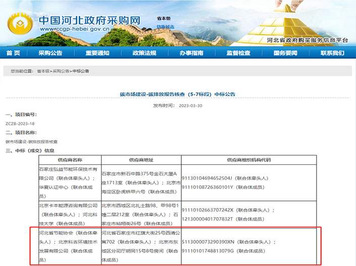 新春新氣象,中標(biāo)開(kāi)門(mén)紅!隨著春天的腳步走來(lái),全國(guó)各地的核查招標(biāo)工作陸續(xù)開(kāi)始。2023年3月30日,河北省政府采購(gòu)網(wǎng)公布了“碳市場(chǎng)建設(shè)-碳排放報(bào)告核查(5-7標(biāo)段)”中標(biāo)公告,科吉與河北省節(jié)能協(xié)會(huì)組建的聯(lián)合體成功...