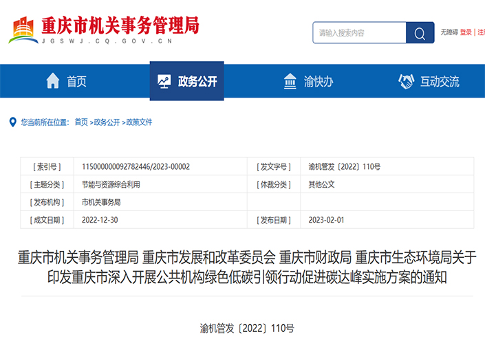 近日日,重慶市公布《重慶市深入開展公共機構綠色低碳引領行動促進碳達峰實施方案》,文件中提出,對標碳達峰目標和碳中和愿景,實現(xiàn)綠色低碳引領行動推進有力,干部職工生活方式綠色低碳轉(zhuǎn)型成效顯著,在全社會綠色...